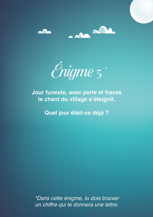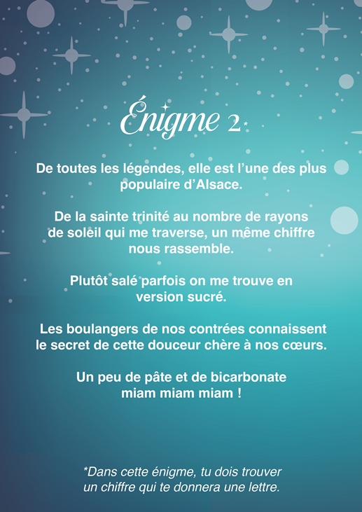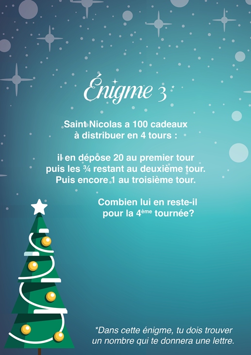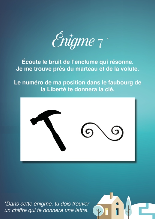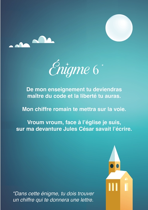 Chaque énigme vous permettra de trouver un chiffre, qui correspond à une lettre de l’alphabet. À la fin du jeu, reconstituez la phrase magique et participez au tirage au sort final pour tenter de gagner de jolis bons d’achat chez nos commerçants partenaires.